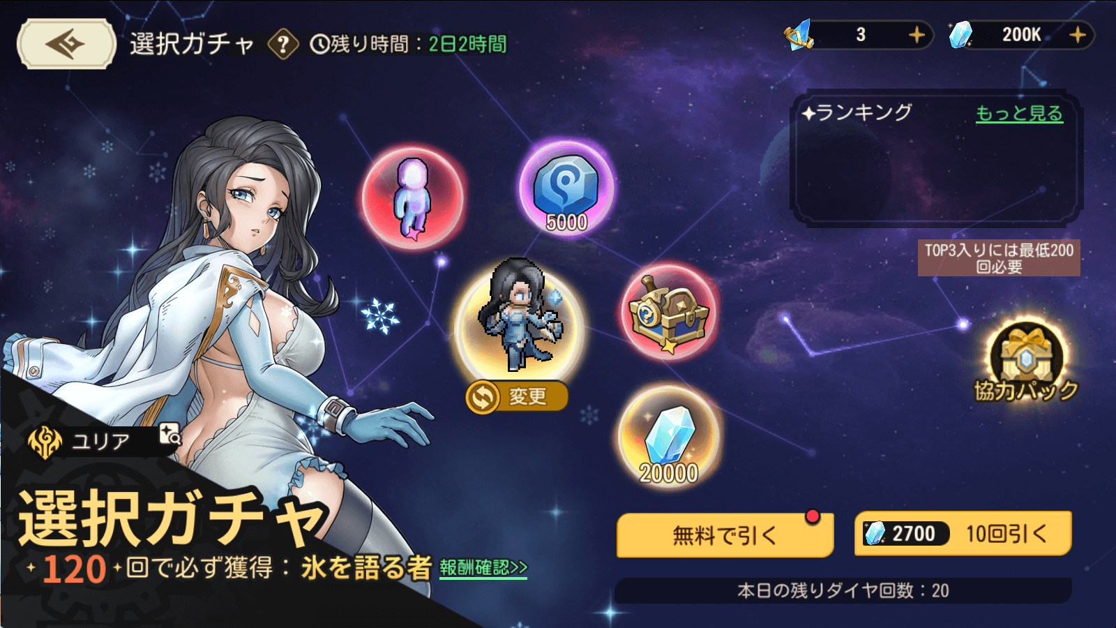 1)期間限定選択ガチャで「氷を語る者・ユリア」を召喚できます。同時に他の神話キャラも選択して召喚できます。