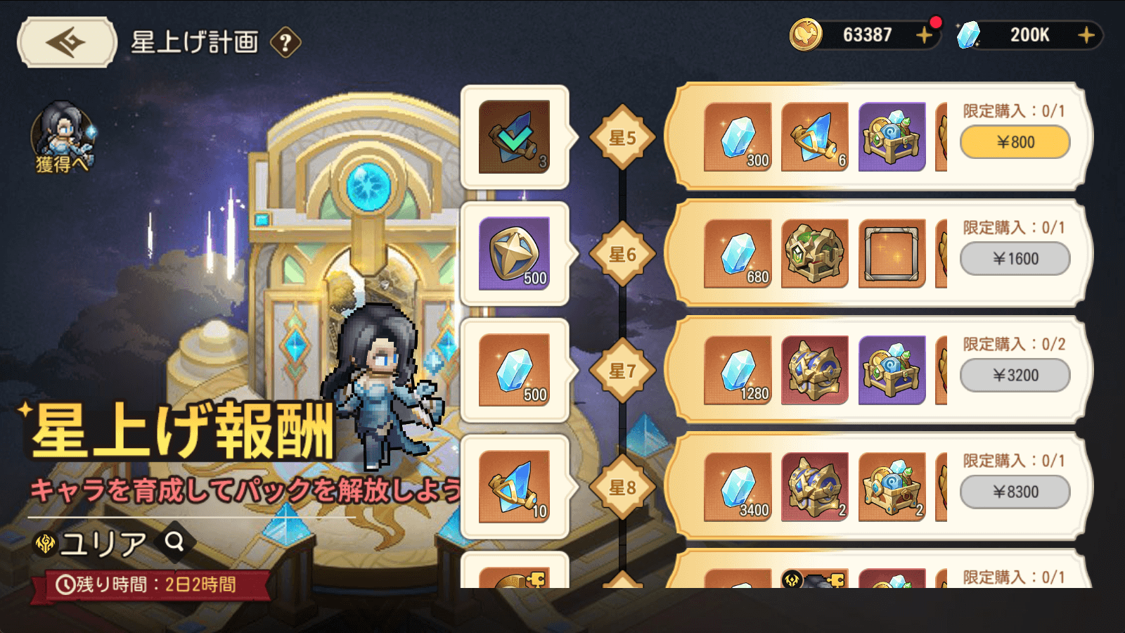イベント期間中、「氷を語る者・ユリア」を星UPさせ、星Lv条件を満たすと報酬を受け取り、対応する星Lvのパックの購入資格を獲得できます。