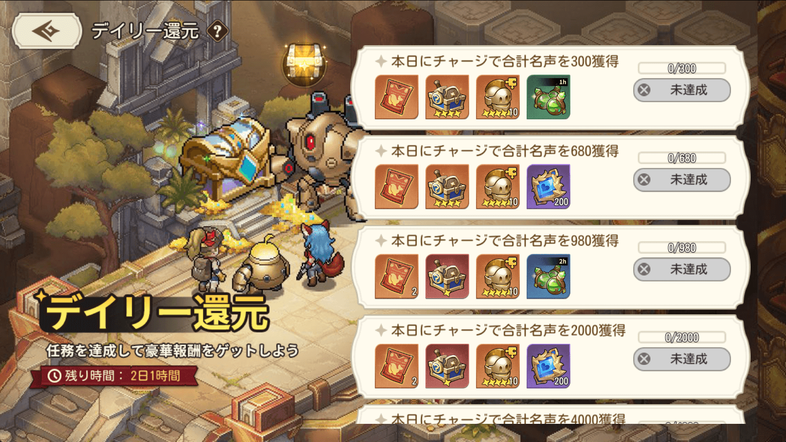 当日達成済みで受け取っていない報酬がある場合、翌日にメールより配布されます。