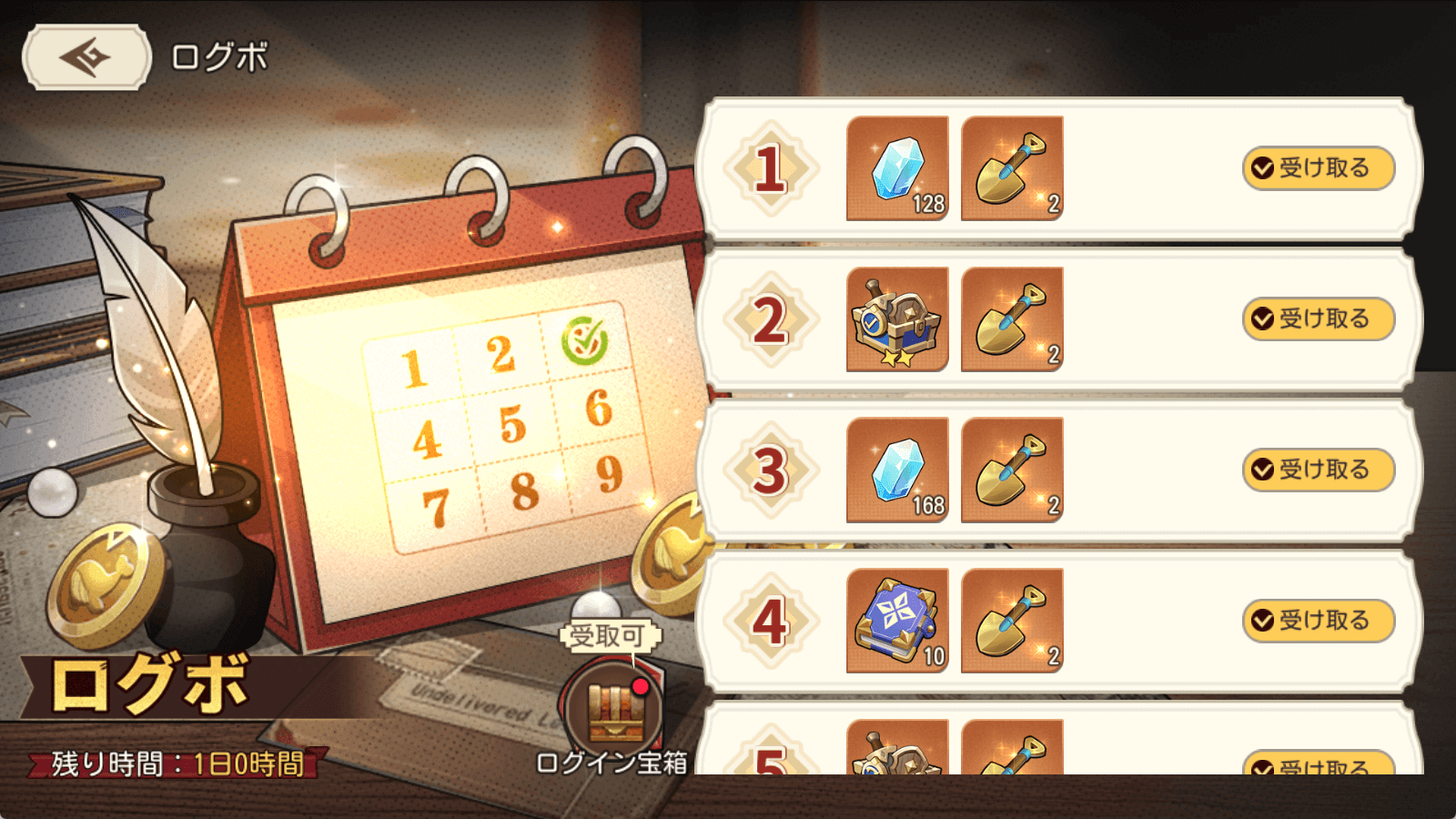 1.ログインするだけで、報酬がもらえます。十日目で特殊報酬「ログイン宝箱」が入手できます。