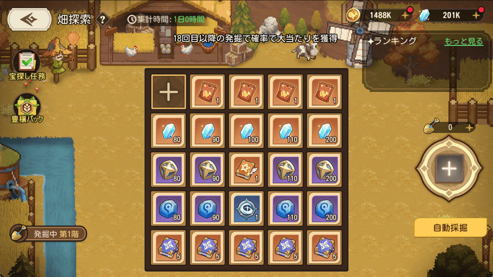 5.「自動発掘」をタップすると、自動でカポチャシャベルを消費しマスを順次に発掘するようになります。大当たりを獲得·力ポチャシャベルが不足·全宝物を入手した場合、自動発掘が中止となります。