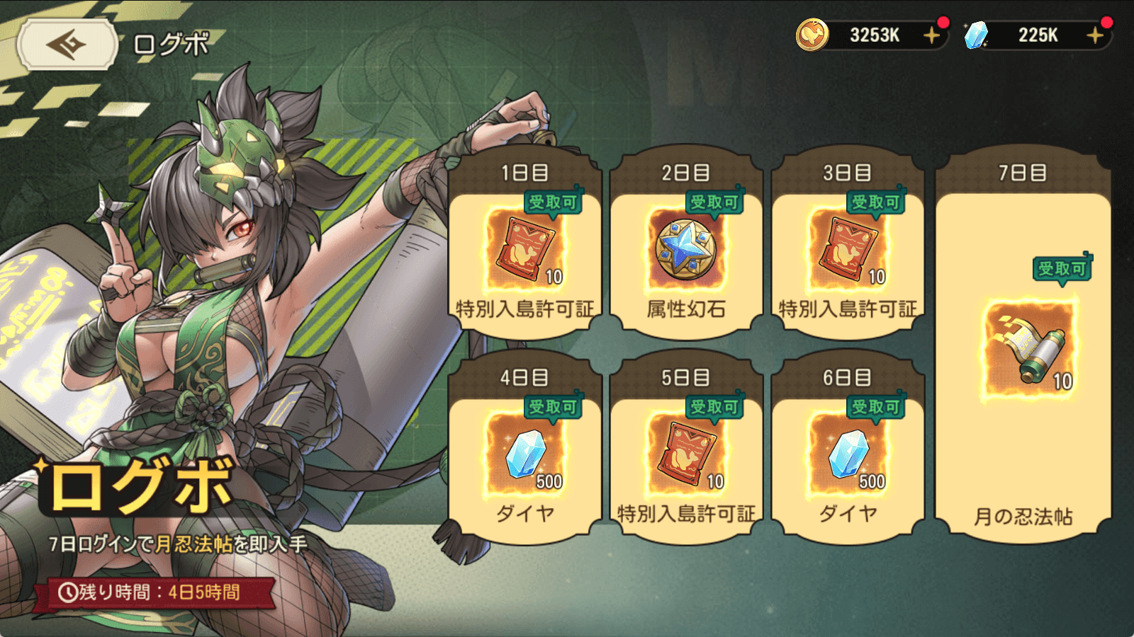 7日目に「月の忍法帖」x10を無料で獲得できます。