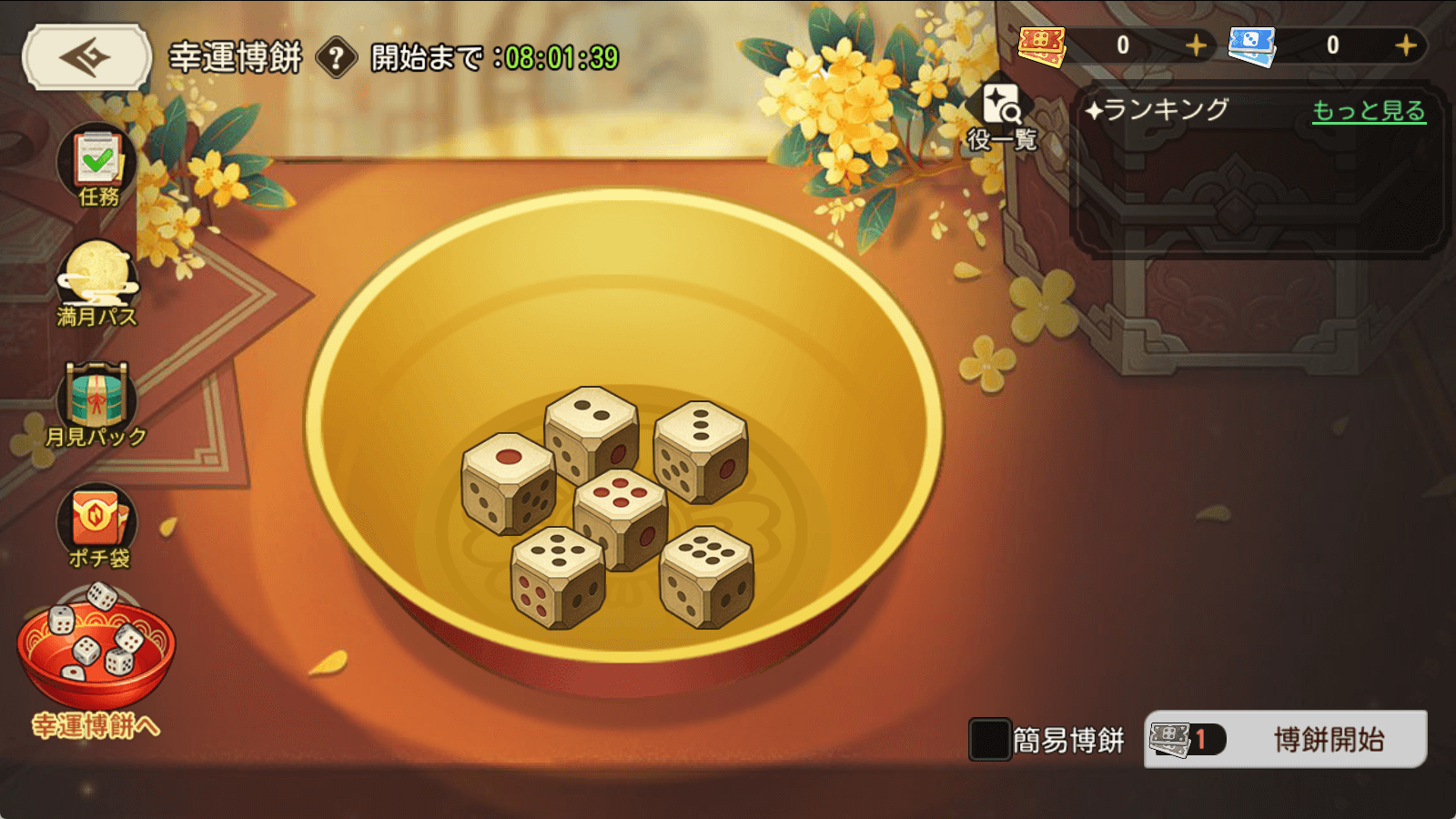 2.幸運博餅に参加するには幸運博餅券が必要となります。サイコロを振って揄った役に応じて報酬とスコアが与えられます。