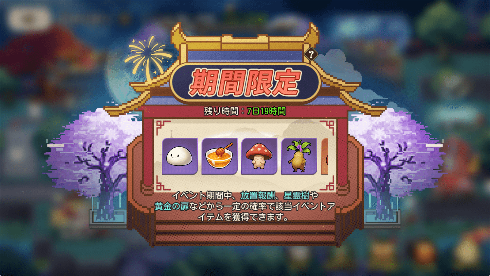 1.イベント期間中、放置報酬·高速放置·星霊樹·黄金の扉により、一定の確率でイベント限定アイテムを入手できます。