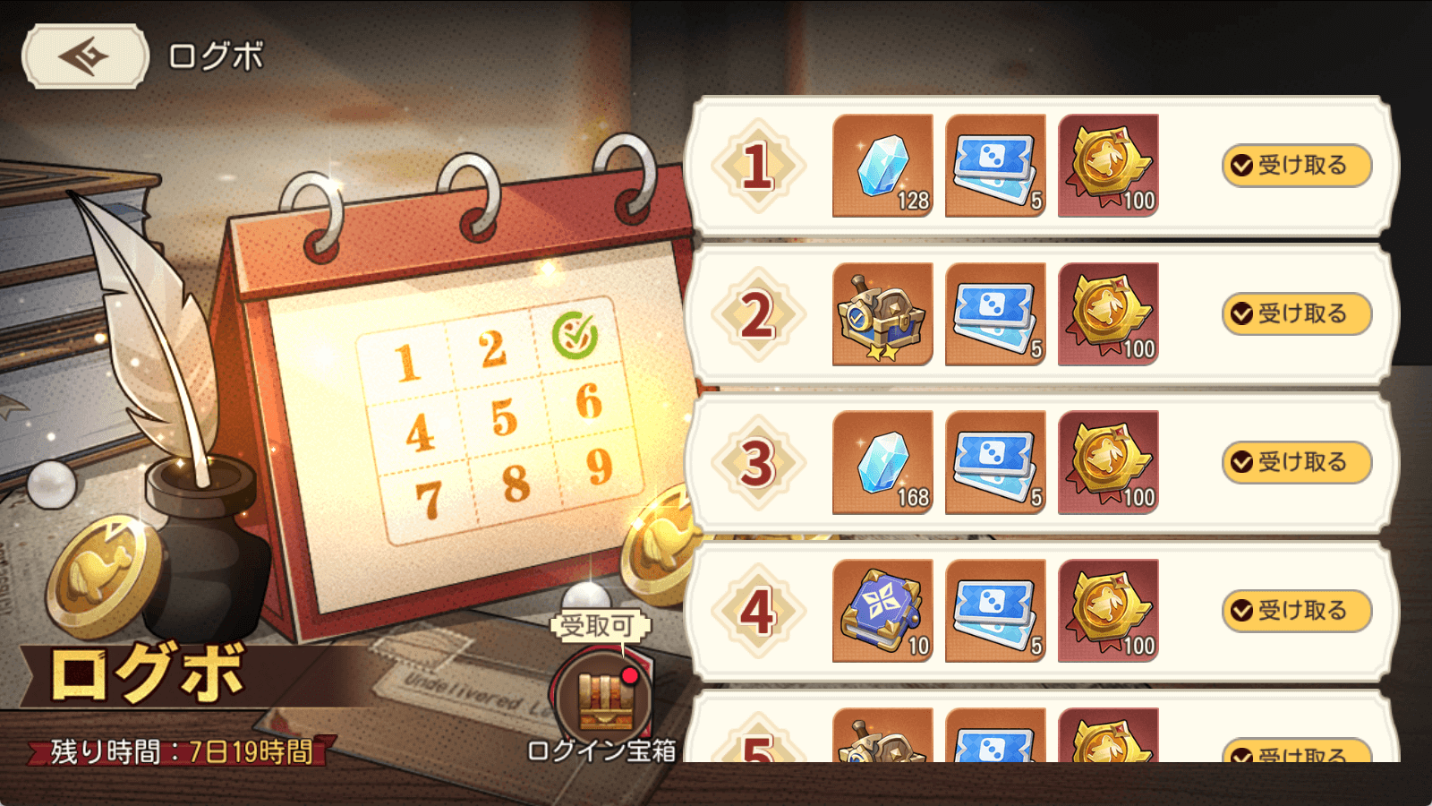 1.ログインするだけで、報酬がもらえます。十日目で特殊報酬「ログイン宝箱」が入手できます。